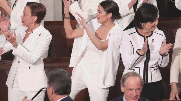 Женщины из числа членов Демократической партии сделали свое молчаливое заявление, придя в зал в белой одежде: этот цвет - один из символов движения суфражисток. Таким образом они выразили свое отношение к тому, как администрация Трампа решала важные для женщин проблемы - от вопросов здравоохранения до равной оплаты труда.