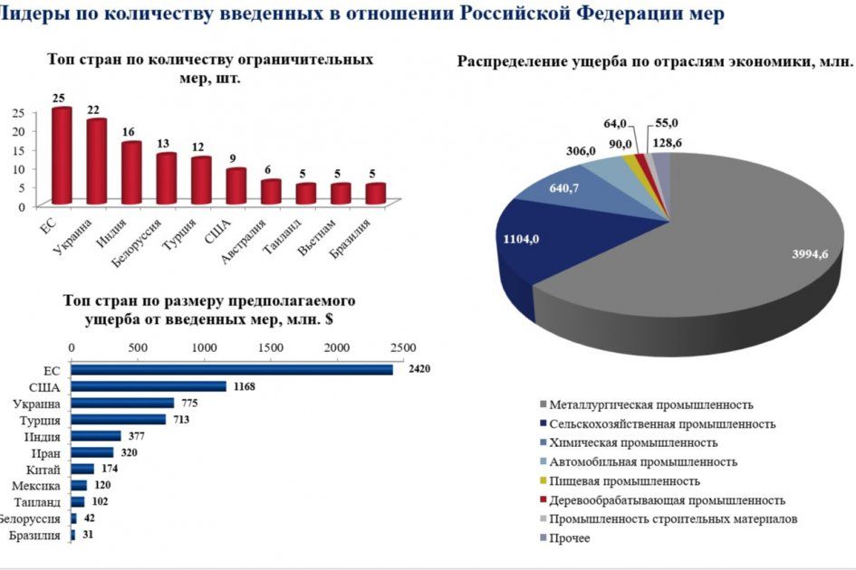 Наибольшие потери от защитных мер понес металлургический сектор — почти $4 млрд, на втором месте — сельскохозяйственная промышленность — $1,1 млрд, замыкает тройку химическая промышленность, которая понесла потери в размере $640 млн.
