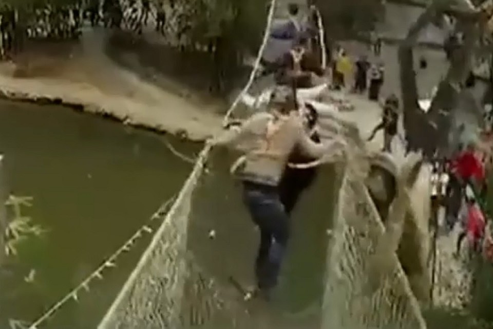 Мост не выдержал нагрузки и порвался. Туристам, которые в этот момент двигались по нему, оставалось только цепляться за веревки.