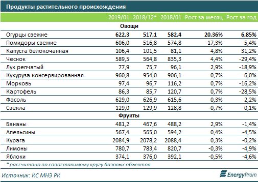 В январе 2019 года вновь ожидаемо и заметно увеличились цены на несезонные свежие овощи — огурцы (+20,4% за месяц) и помидоры (+17,3%). Также выросли цены на капусту (+4,8%), чеснок (+4,4%) и лук (почти +3%). Цены на «зимние» овощи длительного хранения — картофель, морковь, фасоль — выросли менее чем на 1% за месяц. Упала в цене лишь свёкла.