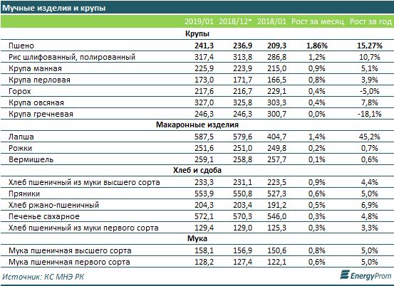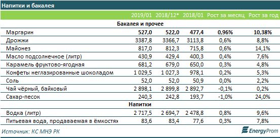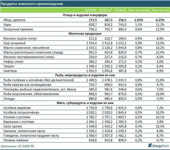 Важно заметить: в данных Комитета по статистике МНЭ РК в январском документе «Розничные цены на основные продовольственные товары в Республике Казахстан (январь 2019 года)» цены за декабрь 2018 не совпадают с ценами, указанными ранее в документе «Розничные цены на основные продовольственные товары в Республике Казахстан (декабрь 2018 года). Разница по некоторым номенклатурам очень значительная, до 35%. В материале использованы декабрьские и январские данные, предоставленные КС МНЭ РК в январе текущего года.