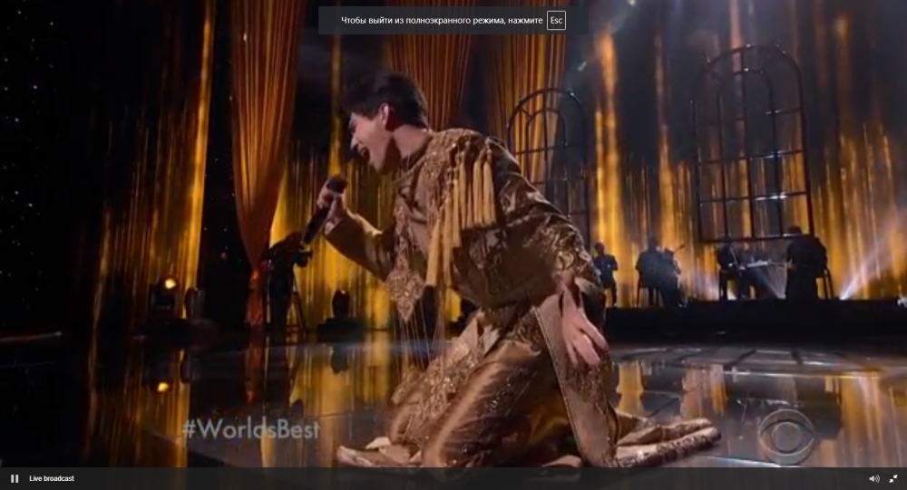 Обладатель уникального голоса, которого на проекте называют "Человек-шесть-октав", вышел на сцену второго тура в золотом костюме с национальными элементами. Он исполнил композицию All by myself Селин Дион.