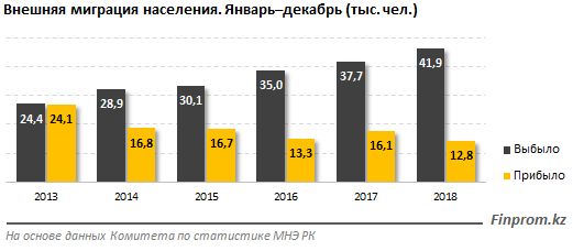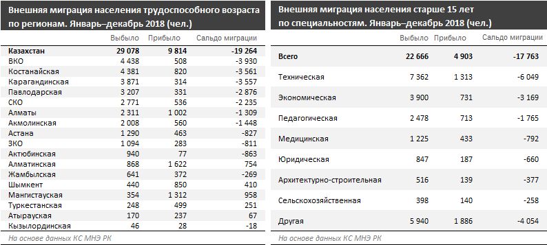 Среди трудоспособного населения за 12 месяцев 2018 года из Казахстана выбыло 29,1 тыс. человек (в том числе в страны СНГ — 26,3 тыс. чел.).