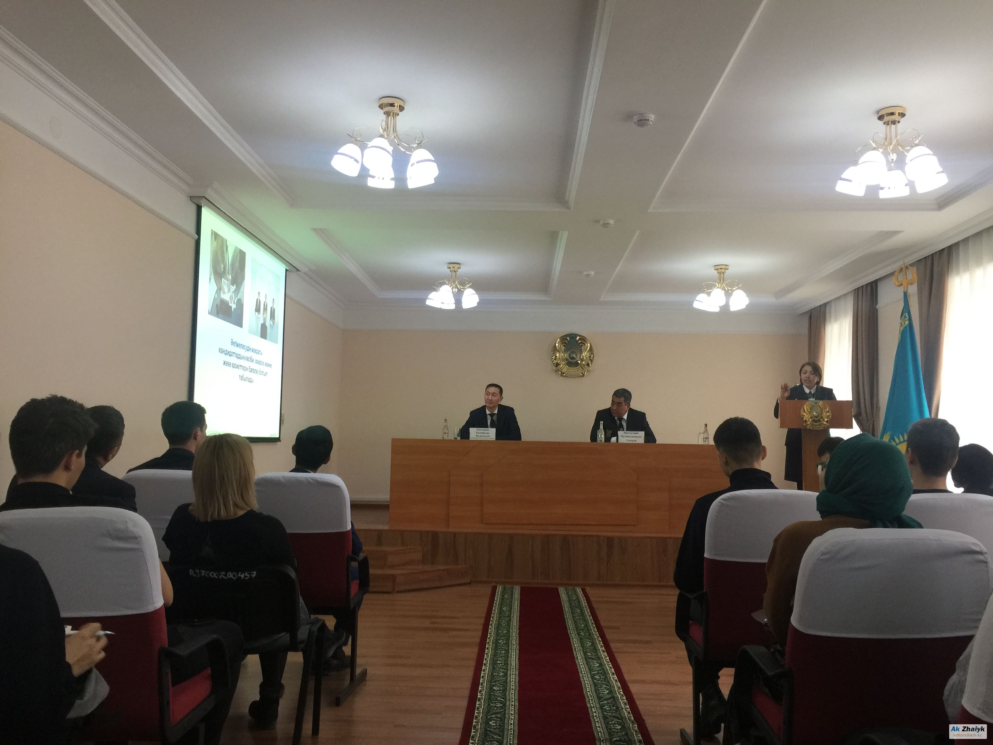 На встрече со студентами местных вузов руководитель департамента Национального бюро по противодействию коррупции по Атырауской области Ныгмеджан САПАРОВ и руководитель Департамента по делам госслужбы и противодействию коррупции Токтамыс ЖУМАГУЛОВ рассказали, чем различаются их ведомства, показали оперативное видео с задержанием взяточников в управлении образования и в ГУВД Атырау, а также ответили на вопросы, в том числе о зарплате своих сотрудников.