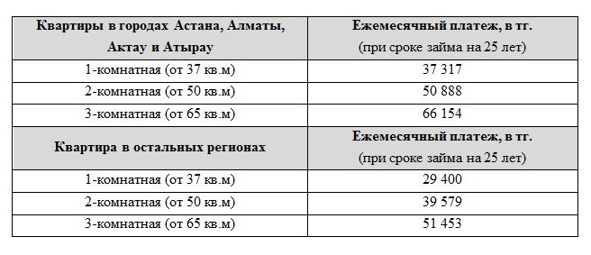 В рамках государственной программы "Нұрлы жер" в основном строятся 1-, 2-, 3-комнатные квартиры. Примерный расчет ежемесячных платежей по программе "7-20-25" в случае приобретения жилья через акиматы: