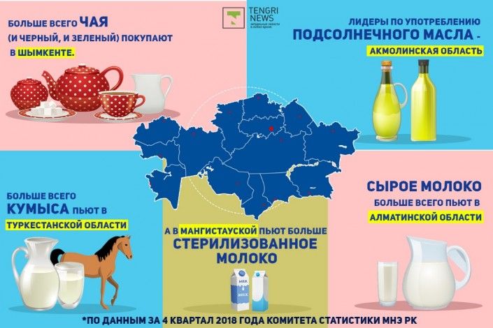 Редакция Tengrinews.kz к Наурызу предлагает узнать, где больше всего в Казахстане едят конины, рыбы и чаще покупают чай. Данные предоставлены Комитетом по статистике МНЭ РК.