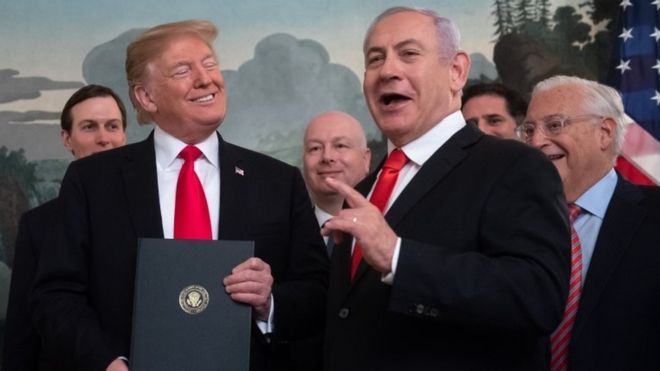 Президент США Дональд Трамп подписал документ, признающий суверенитет Израиля над Голанскими высотами. Премьер-министр Израиля Биньямин Нетаньяху поблагодарил Трампа за этот шаг. Совбез ООН не признает власть Израиля над районом, передает Русская служба BBC.