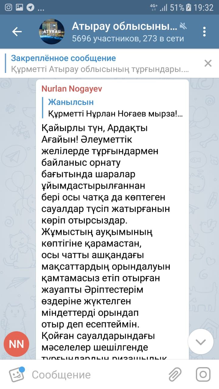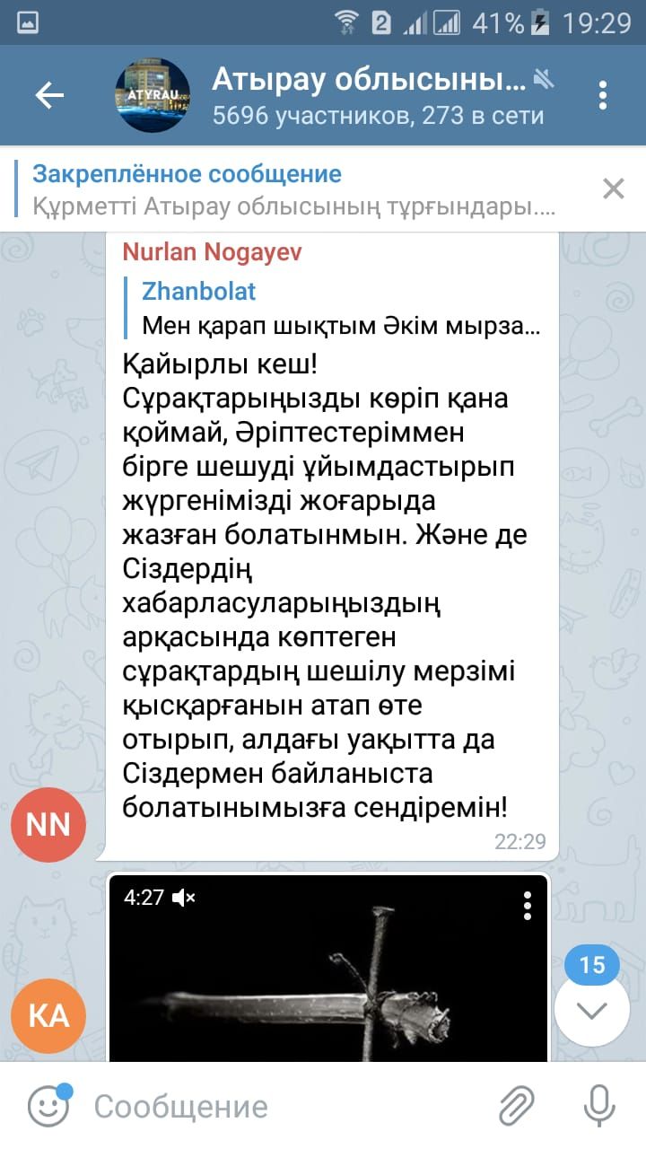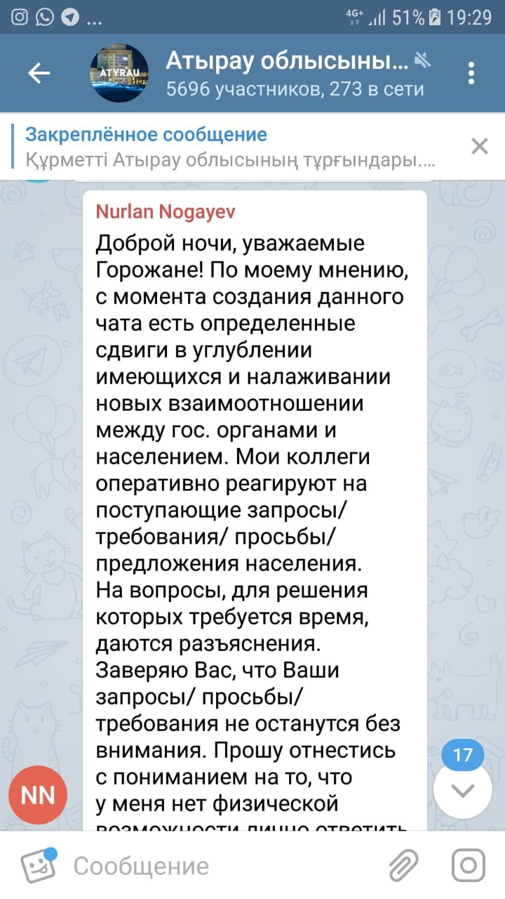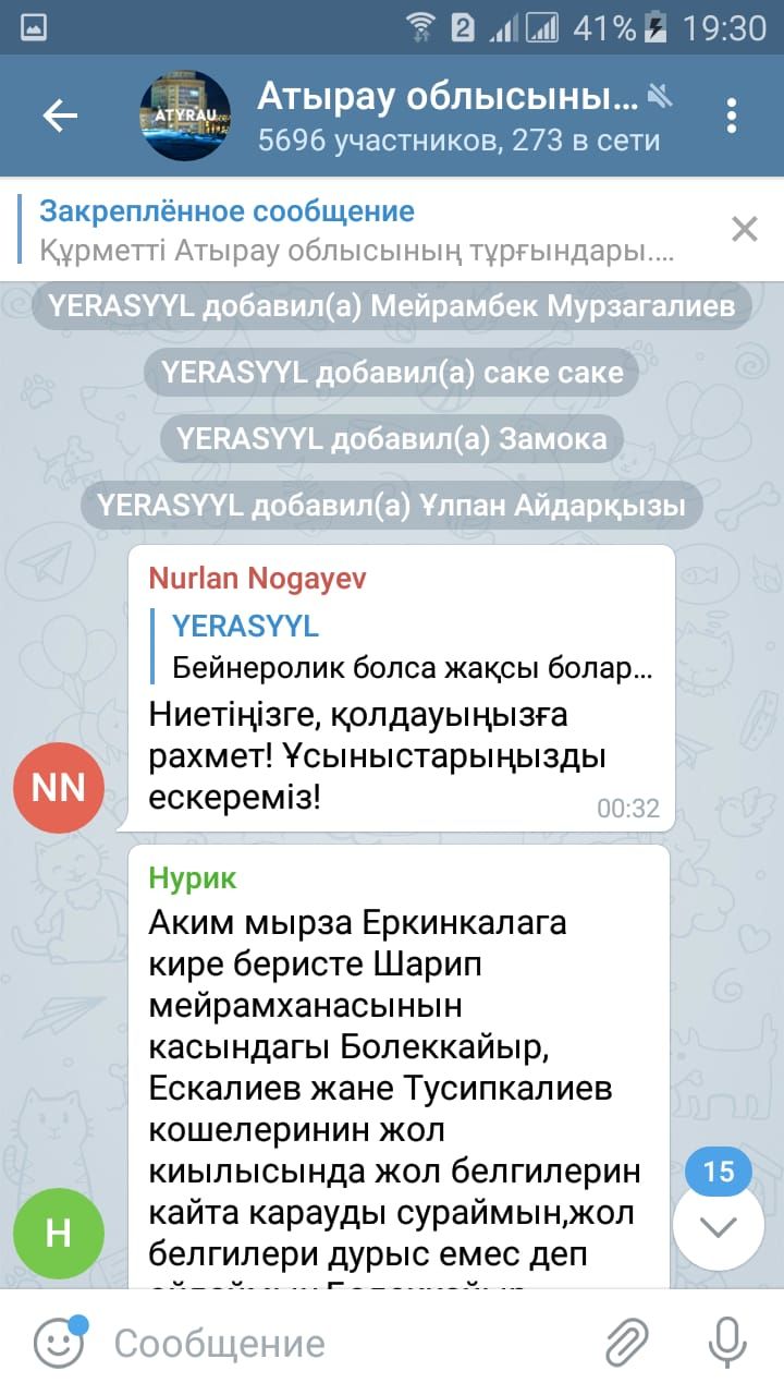 Если посмотреть в шапку профиля канала, то можно увидеть, что количество участников диалога вот-вот перевалит за 6 тысяч. После моей подписки на канал смартфон неустанно вибрировал в моём кармане - пришлось воспользоваться настройками чата, чтобы отключить звук всплывающих сообщений. Впрочем, это заняло несколько секунд. По словам пресс-секретаря областного акимата Серикжана ЕРМЕНТАЕВА, с момента открытия канала и на сегодняшний день общее число обращений от жителей составляет почти 4 тысячи. И пока без ответа осталось всего 1,4%. Интересен тот факт, что в чате присутствует и аким области Нурлан НОГАЕВ, который тоже даёт ответы. Как по секрету рассказали сотрудники акимата, практически после каждого совещания идет «разбор полетов», кто как отвечает в Telegram.