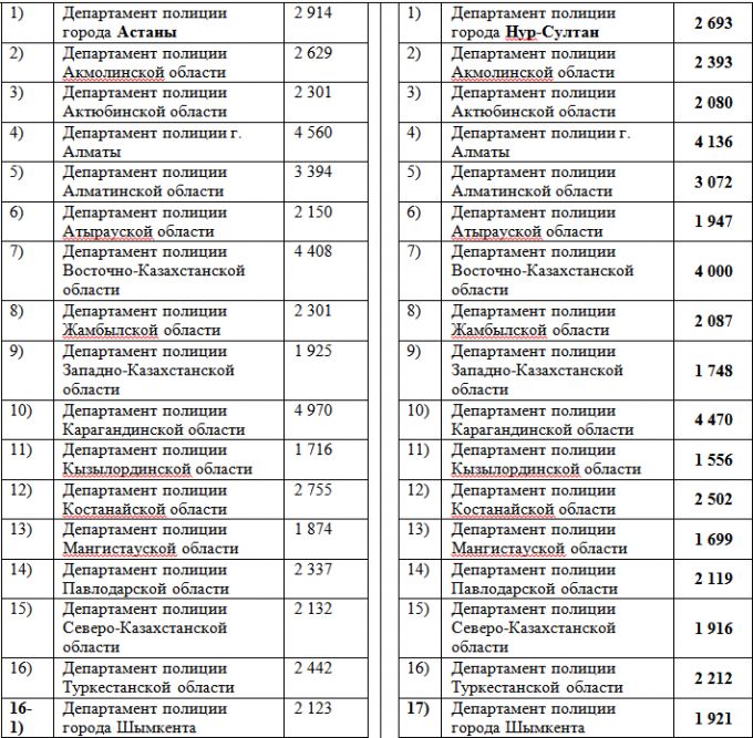 Лимит штатной численности Департамента полиции Нур-Султана составляет 2 914 сотрудников, после нововведения он сократится до 2 693. Лимит ДП Алматы - 4 560 человек, в случае принятия проекта он составит 4 136.