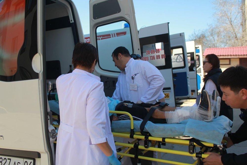 Парень по имени Медет условно получил ожоги и, кажется, повредил позвоночник. Врачи максимально осторожно проверяют, есть ли еще переломы, накладывают повязку на ожог и фиксируют шею.