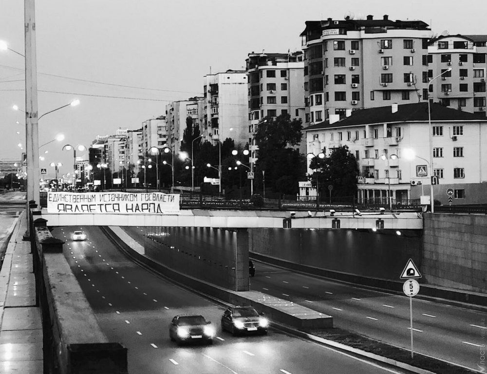 Алматинский художник Роман Захаров вывесил плакат с надписью: «Единственным источником госвласти является народ» (цитата из Конституции) на мосту на пересечении проспектов Аль-Фараби и Достык. Специализированный межрайонный суд по административным делам дал ему 5 суток административного ареста по статье «Мелкое хулиганство». Адвокаты будут обжаловать решение, сообщает Vlast.kz.