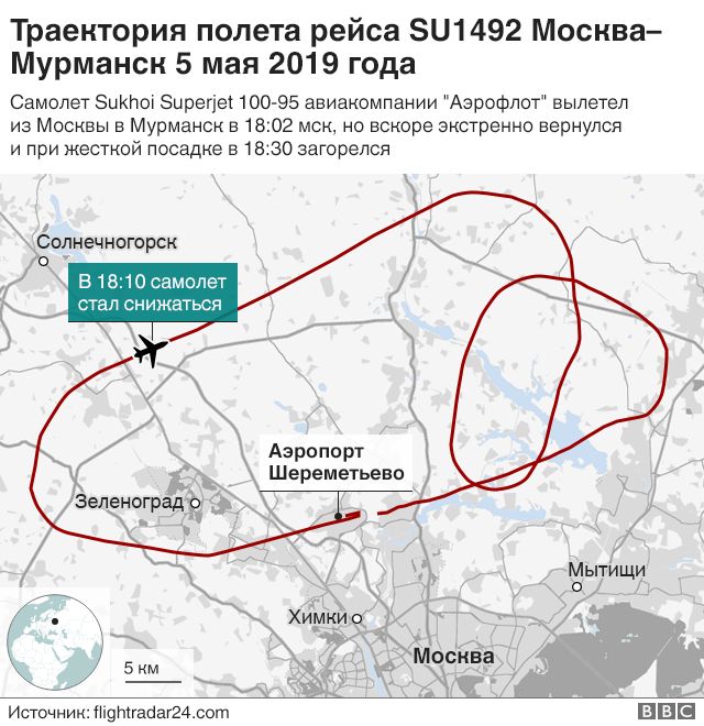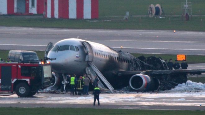 Авиалайнер Sukhoi Superjet 100 авиакомпании "Аэрофлот" с регистрационным номером RA-89098 сгорел в московском аэропорту Шереметьево после аварийной посадки в воскресенье, 5 мая 2019 года. В результате авиакатастрофы погиб 41 человек. Подробности сообщает Русская служба BBC.