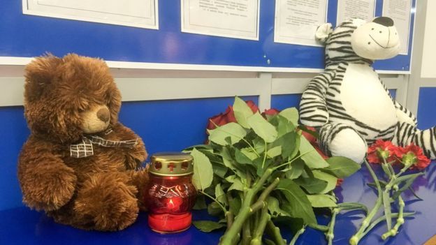 Возле здания мурманского аэропорта образовался стихийный мемориал погибшим. Люди несут к нему цветы, свечи, мягкие игрушки - среди погибших есть дети.