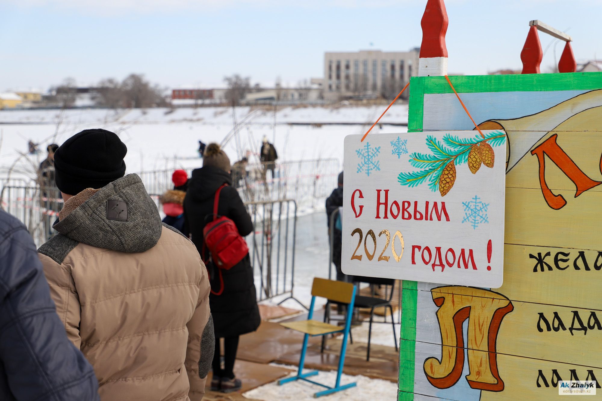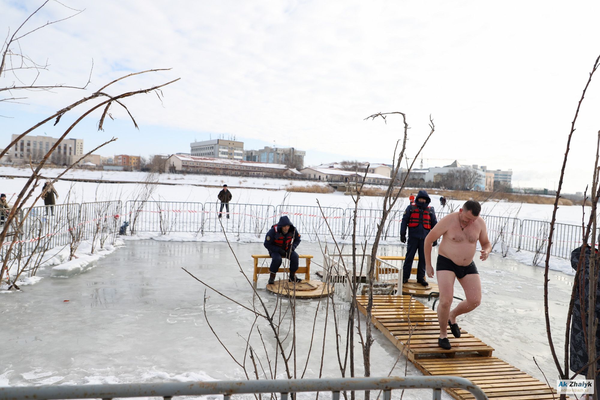 В этом году в Атырау зима выдалась аномально теплой, из-за чего все рождественские купели были организованы ближе берегу.