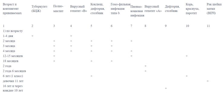 Ранее сообщалось, что в перечень заболеваний, против которых проводятся обязательные профилактические прививки, вошли: вирусный гепатит А (В15), вирусный гепатит В (В16), гемофильная инфекция типа b (В96.3), дифтерия (А36), злокачественные новообразования шейки матки (С53), коклюш (А37), корь (В05), краснуха (В06), пневмококковая инфекция (В95.3), полиомиелит (А80), столбняк (А33-А35), туберкулез (А15-А19) и эпидемический паротит (В26).