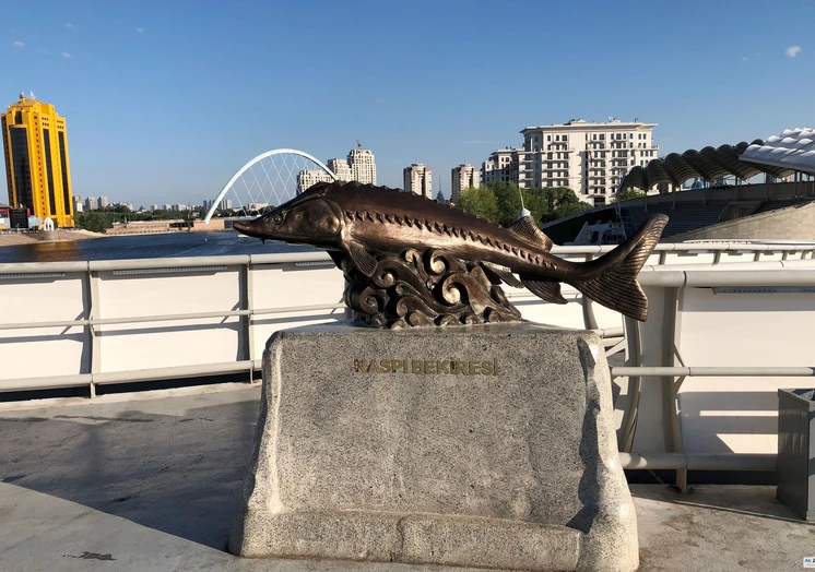 Здесь же находится памятник символу Атырауской области – осетру. Местные вандалы зачем-то укоротили ему усы.