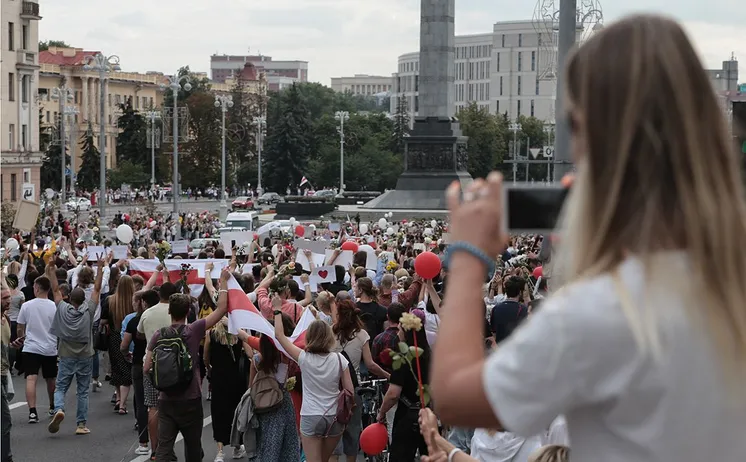 Участников митинга призывают не подходить близко к зданию, которое охраняют омоновцы, и не давать повода для провокаций, сообщает Telegram-канал «Мая краiна Беларусь». На опубликованном в канале видео можно увидеть, как пришедшие на площадь девушки обнимают опустивших щиты омоновцев.
