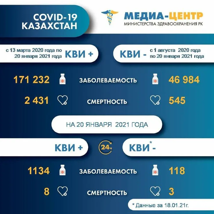 За прошедшие сутки в Казахстане выявлены 1134 заболевших с положительным ПЦР на коронавирусную инфекцию.