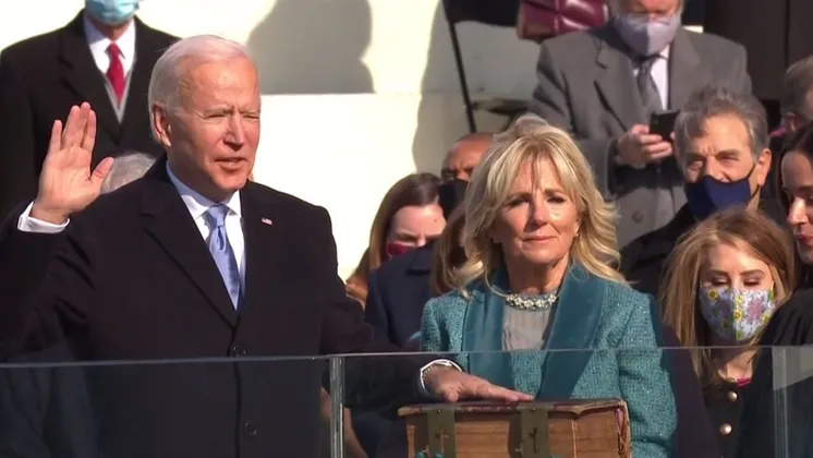 В рамках 59-й по счету церемонии инаугурации Байден на западном крыльце Капитолия произнес текст присяги, состоящий из 35 слов, на Библии. Для приведения к присяге Байден использовал Библию, которая хранится в его семье с 1893 года и уже использовалась для приведения его к присяге в качестве вице-президента.