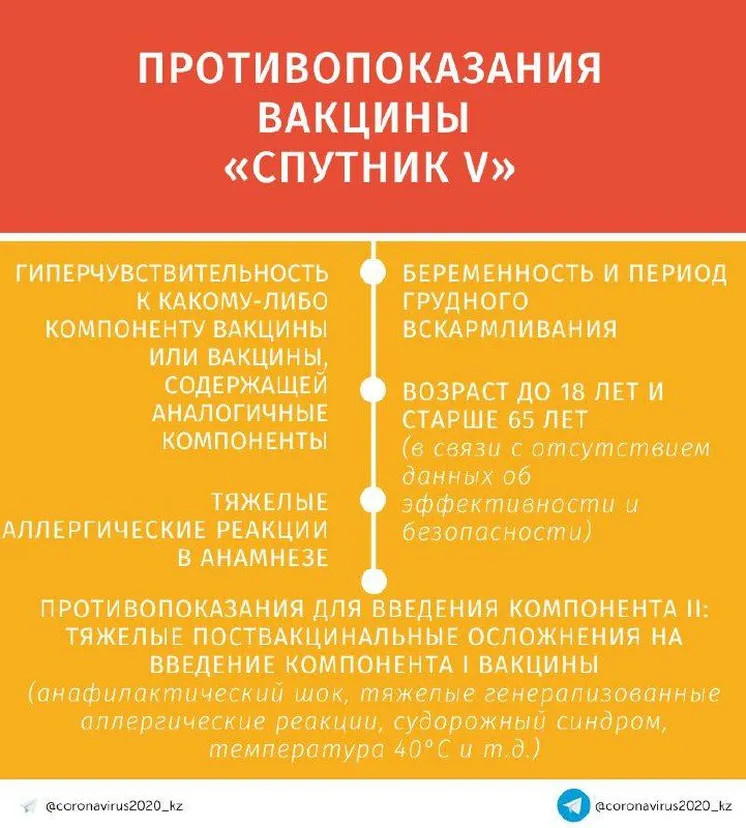 Выступая на брифинге в СЦК, Марат Шоранов сообщил, какие противопоказания имеются к введению вакцины КВИ (Спутник V). По его словам, это: