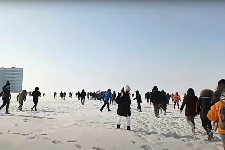 Во Владивостоке из-за перекрытия центра города акция проходит на набережной Спортивной гавани. Людей фактически выгнали на лед.