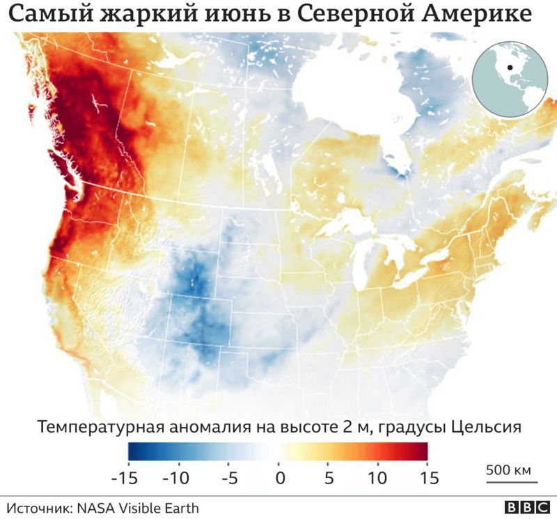 В той же Англии, например, средняя температура календарного лета (с июня по август) за последние 100 лет уже выросла на 2-3°. А сразу в нескольких городах Канады и на северо-западе США в июне была зафиксирована температура, превышающая рекордные показатели прошлых лет сразу на 5°.