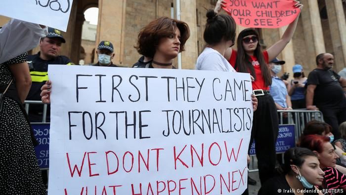 Руководство телекомпаний "ТВ Пирвели", "Мтавари архи", "Формула" и "Кавкасиа" требуют от властей наказать всех причастных к совершению насилия. В сетке вещания этих телекомпаний на черном фоне идет список 53 журналистов, избитых 5 июля противниками гей-парада. Акция протеста проходит под лозунгом "В отставку Ираклия Гарибашвили, наказать всех насильников".