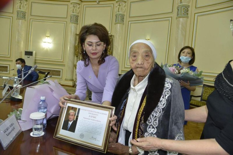 В свою очередь, Ханымбуби Акжолова, поблагодарив за теплые поздравления главу государства, направила Президенту один экземпляр новой книги «Бір ғасыр биігінде».