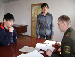 Как выразился один из родителей, собравшихся у ворот областного военкомата, раньше офицеры, приезжающие за новобранцами («покупатели»), не нянчились, а сейчас ездят по районам, выбирают для себя подходящий «товар». По словам заместителя командира воинской части №03825 Григория ДАНИЛКОВА (на фото справа), он находится в Атырауской области с середины марта. Побывал в Жылыойском, Курмангазинском и Индерском районах, познакомился со всеми призывниками, их личными делами и родственниками. Отобрал около двадцати кандидатов для службы в своей части. Офицер отмечает достаточно чёткую работу медиков, «отсеивающих» парней со слабым здоровьем. Ведь если солдат хил, то какой из него солдат? Это не солдат, а первый кандидат в дезертиры.