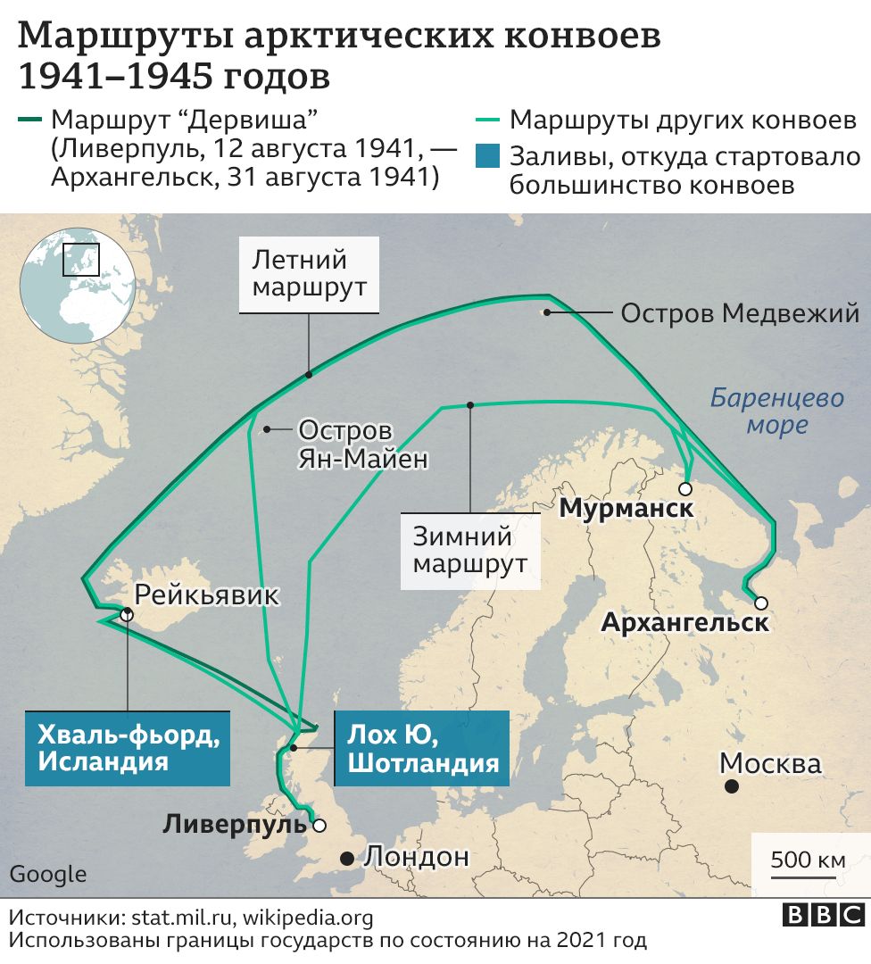 С 31 августа 1941 года (начиная с первого конвоя под кодовым названием "Дервиш") и до конца войны северные порты Мурманск и Архангельск приняли 78 караванов из Великобритании и США с военной помощью Советскому Союзу для борьбы с фашистской Германией в рамках программы ленд-лиза.