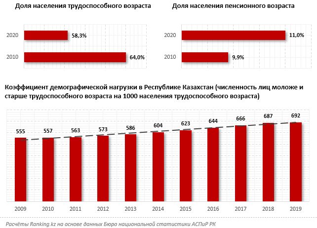 Таким образом в Казахстане наблюдается старение населения. Если в 2010 году доля населения пенсионного возраста составляла 9,9%, то уже в 2020-м - 11%. Тем временем доля граждан трудоспособного возраста, наоборот, заметно снизилась: с 64% в 2010 году, до 58,3% в 2020-м. Согласно шкале демографического старения Ж. Боже-Гарнье - Э. Россета, Казахстан находится на отметке «собственно преддверие старости».