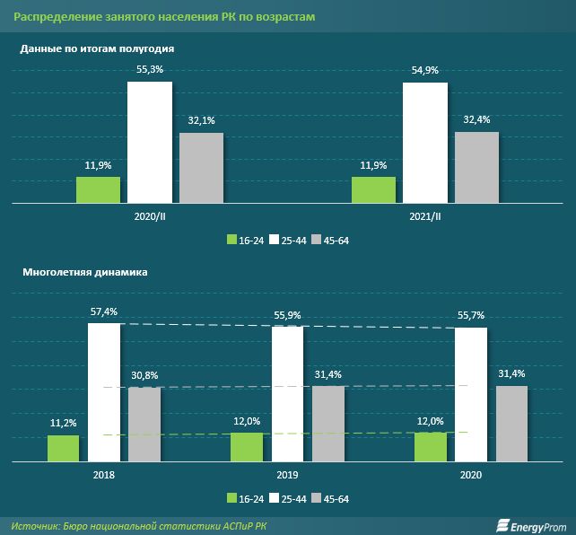 Так, по итогам второго квартала текущего года, доля занятых в «любимом возрасте» работодателей (от 25 до 44 лет) сократилась до 54,9% от общей численности, против 55,3% годом ранее.