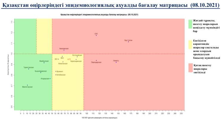 - В «желтой» зоне: г. Шымкент, Алматинская, Актюбинская, Костанайская, Карагандинская, Западно-Казахстанская, Восточно-Казахстанская области.