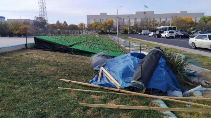 Журналист Lada.kz сфотографировал пластиковые тюльпаны 24 октября. Часть из них надломлена.