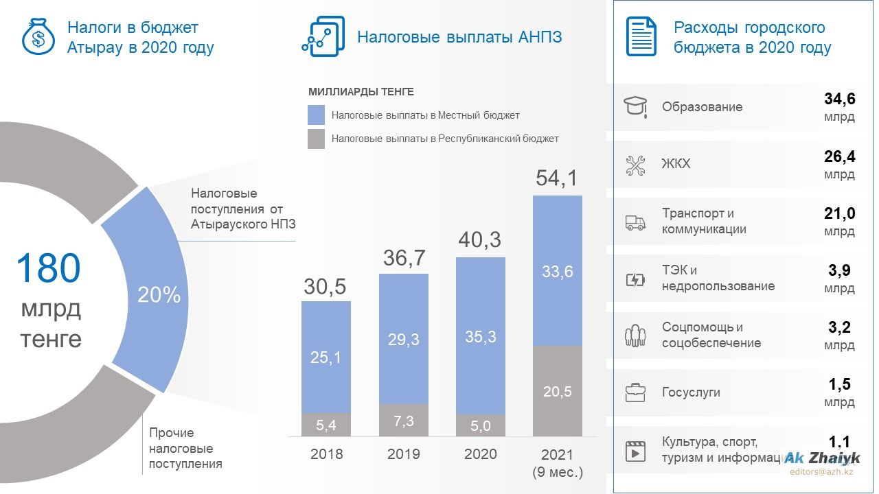 В то время как крупнейшие нефтяники-налогоплательщики в 2020 году в основном уменьшили налоговые выплаты из-за сокращения добычи, налоги АНПЗ за 2020 год оказались на 21% больше, чем за 2019 год. В 2021 году завод продолжает демонстрировать увеличение объема переработки нефти, а соответственно и поступление в бюджет города налогов так же вырастет. За девять месяцев АНПЗ уже заплатил налогов на 54,1 млрд тенге, в том числе 33.6 млрд тенге в местный бюджет.