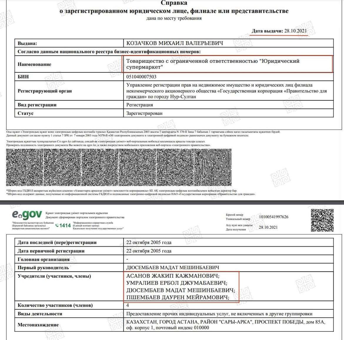 Он отмечает, что на портале Egov любой желающий может запросить справку и перепроверить эти данные - юрлицо действующее. Также, журналист отмечает, что третьим совладельцем фирмы является Ербол Умралиев, с лета 2021 года работающий судьей Верховного суда, а ранее трудившийся руководителем аппарата Верховного суда.