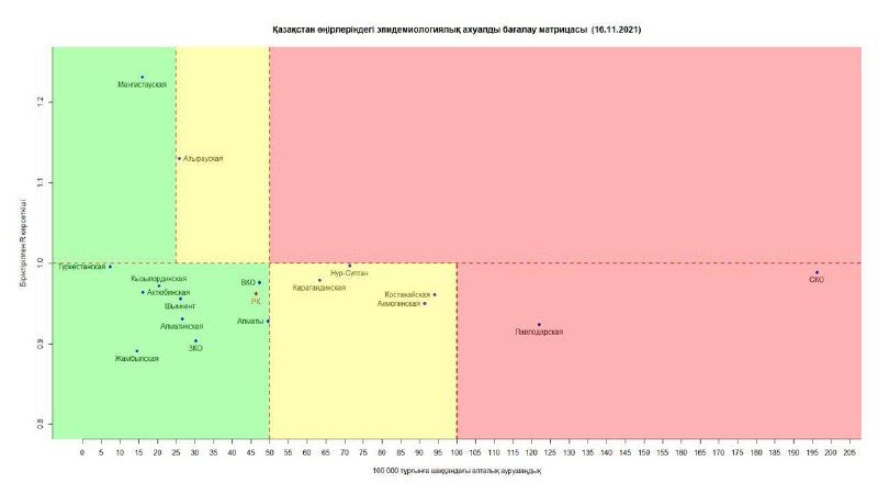 - в «желтой» зоне: г. Нур-Султан, Атырауская, Акмолинская, Карагандинская, Костанайская области;