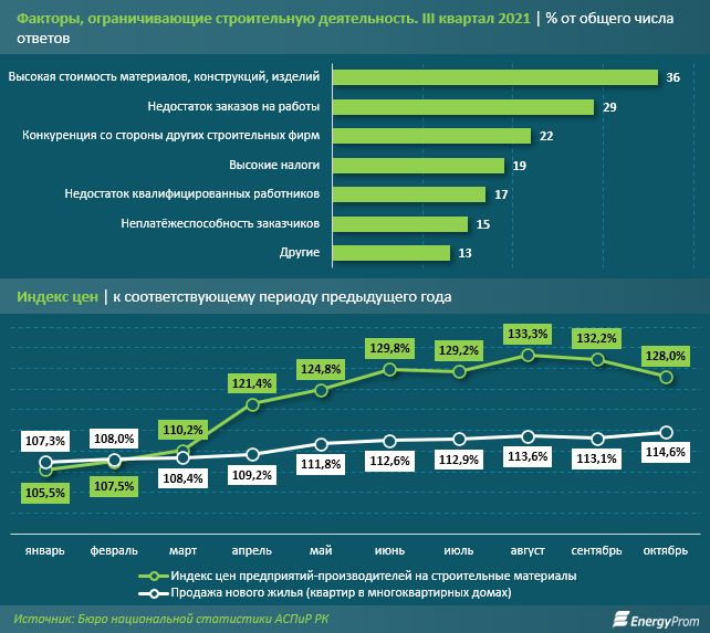 По данным обследования Бюро национальной статистики АСПиР РК, по итогам третьего квартала 2021 года в стране наблюдается снижение деловой активности строительных организаций и ухудшение экономической конъюнктуры в секторе строительства.