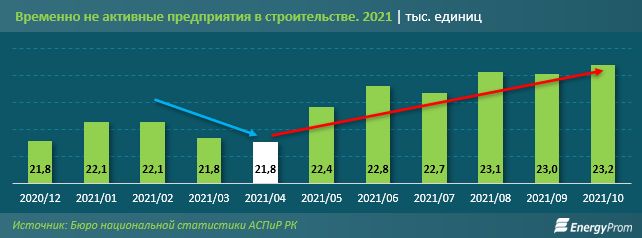 Наглядно можно наблюдать: с начала текущего года по апрель временно не активных предприятий в строительстве становилось меньше, то есть экономическая активность росла. Но после скачка цен на стройматериалы в апреле динамика резко сменилась на обратную. Так, уже начиная с мая наблюдается рост количества временно не активных компаний. К концу октября показатель достиг 23,2 тыс. — на 6,5% больше по сравнению с апрелем текущего года.