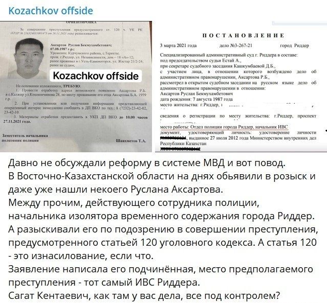 "В Восточно-Казахстанской области на днях объявили в розыск и даже уже нашли некоего Руслана Аксартова. Между прочим, действующего сотрудника полиции, начальника изолятора временного содержания города Риддер.