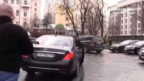 На кадрах видно, как к автомобилю бывшего главы государства подходит несколько человек, он в это время поспешно садится в автомобиль со словами: "Поехали, твою мать!".