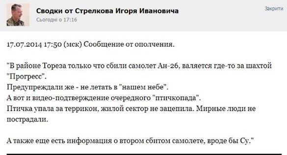Впоследствии сообщение Гиркина было удалено, а новости СМИ - скорректированы. Тем не менее, на сайте РИА Новости, например, до сих пор остается публикация о якобы сбитом Ан-26 со ссылкой на неких очевидцев.