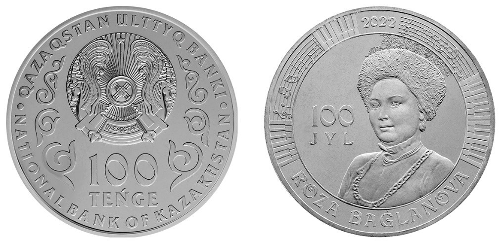 «Монеты из мельхиора номиналом 100 тенге продолжают серию «Выдающиеся события и люди». В 2022 году исполнится 100 лет народному артисту СССР, Народному герою Казахстана, советской, казахской оперной и эстрадной певице Розе Баглановой.