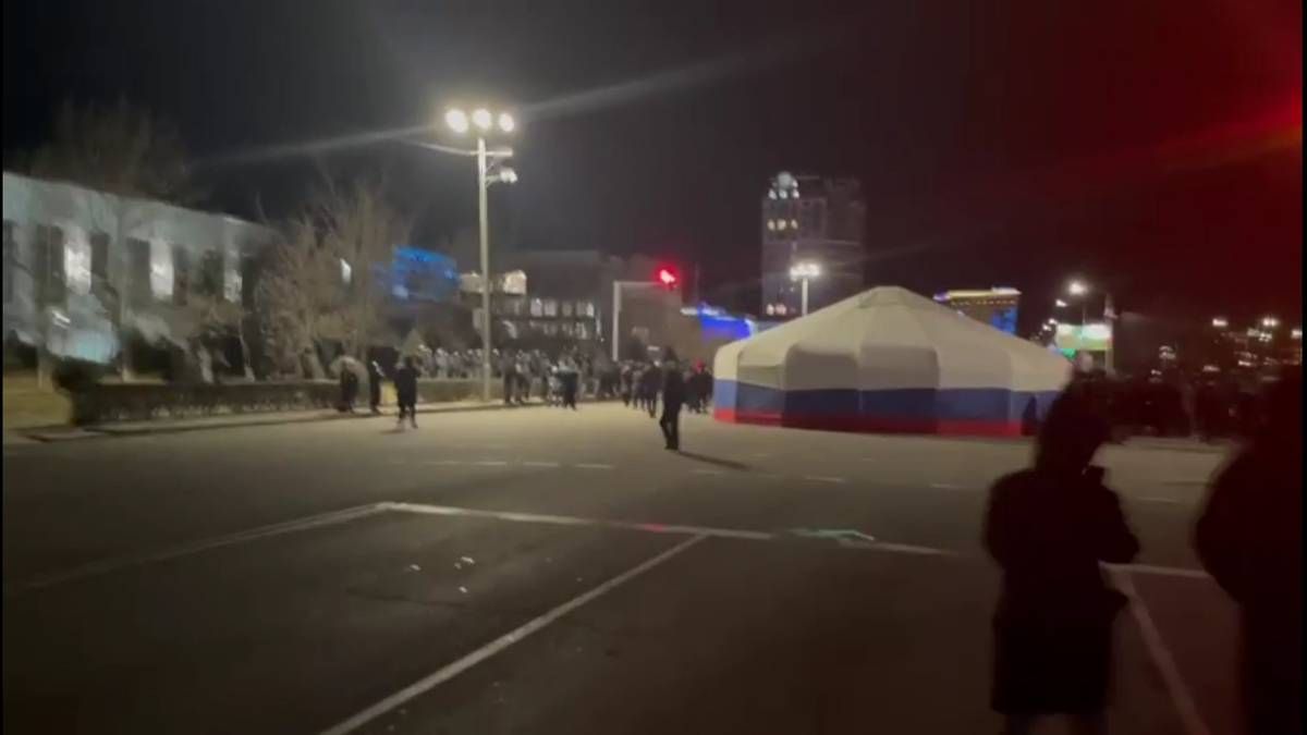 Назвать точное количество собравшихся на площади Ынтымак трудно, но речь может идти о нескольких сотнях граждан. Здесь же установили юрту, видимо, для обогрева. Температура воздуха сейчас в Актау -3 градуса.