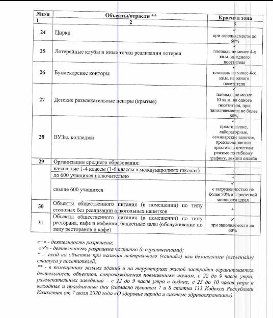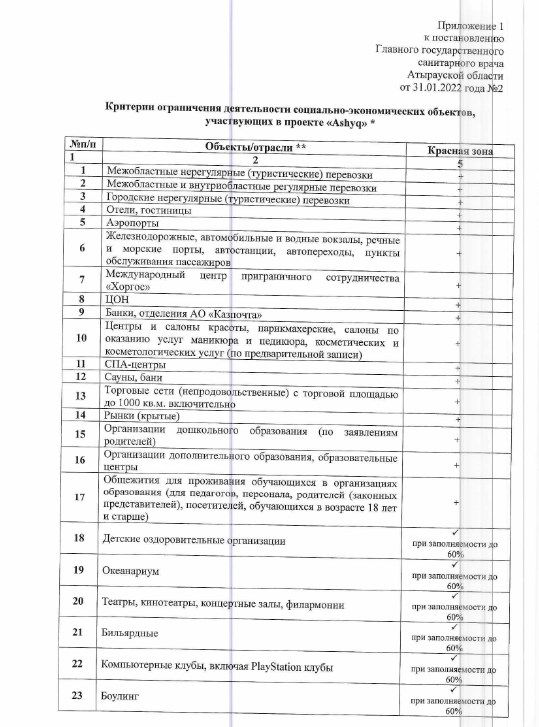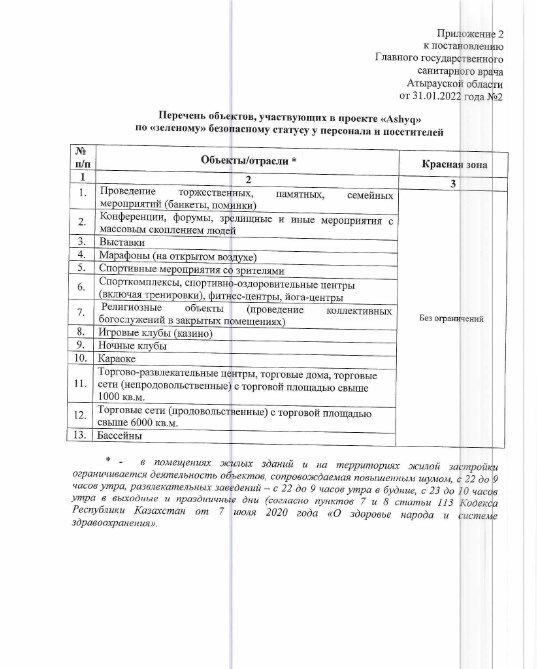 Социально-экономическим объектам, участвующим в проекте Ashyq, согласно Приложению 2 к настоящему постановлению, при условии наличия безопасного («зеленого») статуса у сотрудников и посетителей (вакцинация или ревакцинация, ПЦР-тест с отрицательным результатом не более 7 суток с момента отбора проб, лица, имеющие постоянные медицинские противопоказания, переболевшие в течение последних 3 месяцев).