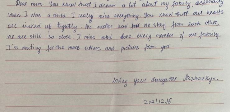 "Дорогая мама. Вы знаете, как я много мечтаю о своей семье: особенно когда я была ребенком, я очень скучала по всем. Вы знаете, что наши сердца тесно связаны. Мы все еще так близки. Я скучаю и люблю каждого члена нашей семьи. Я жду от вас больше писем и фотографий. С любовью, ваша дочь Акжаркын", - говорится в тексте письма, датированного 15 декабря прошлого года.