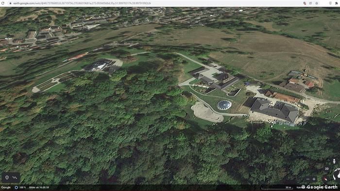 Территория поместья Зеелах в Баден-Бадене, спутниковый снимок. Слева - исторический дом дипломата Хрептовича и сквер с фонтаном. Справа - современный жилой комплекс и ландшафтный парк, под которым расположена спа-зона со стеклянным куполом