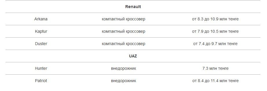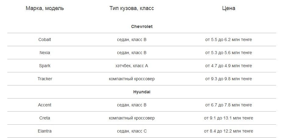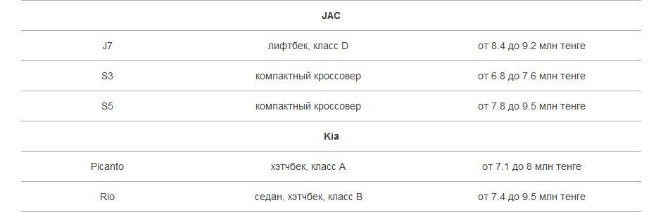 Список автомобилей, которые можно будет купить по новой программе льготного автокредитования с лимитом до 10 млн тенге