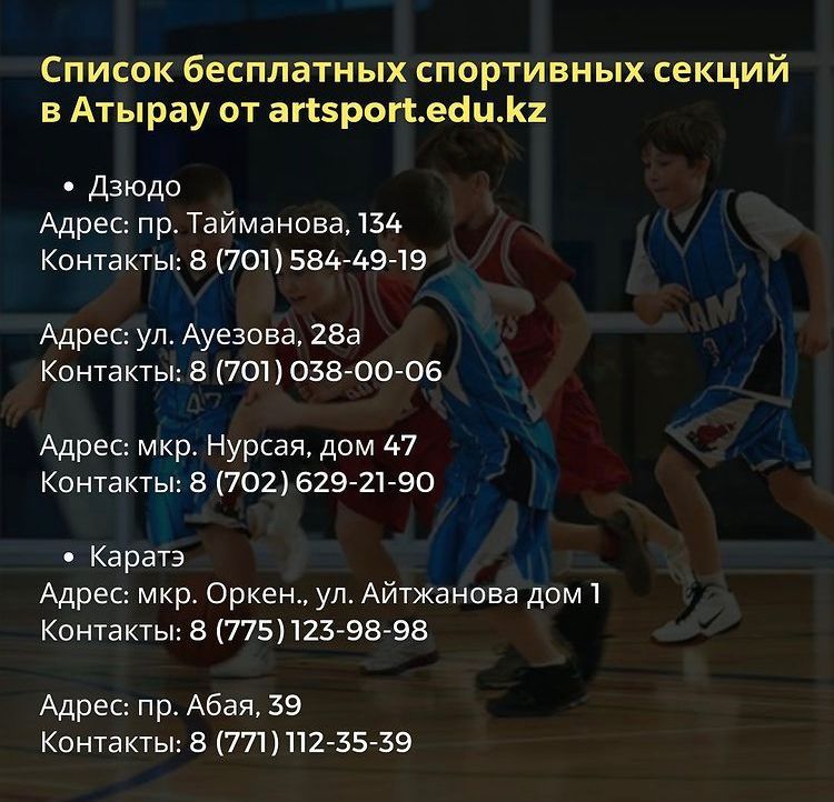 По информации управления физической культуры и спорта Атырауской области, согласно госзаказу по подушевому нормативному финансированию детских спортивных секций в данное время в нескольких точках города и в микрорайонах на бесплатной основе работают секции по 9 видам спорта. Ребята могут посещать секции спортивных танцев, шахмат, футбола, волейбола, бокса, вольной борьбы, художественной гимнастики, карате, плаванию и дзюдо. В настоящее время в этих клубах занимаются 6538 детей.