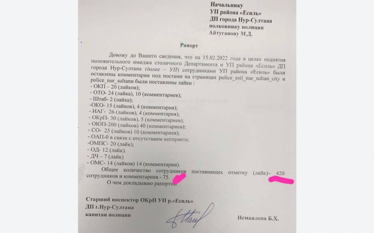 Казахстанцы рассылают в мессенджерах и социальных сетях фотографию предполагаемого рапорта на имя начальника столичной полиции района Есиль полковника Мадияра Айтуганова.